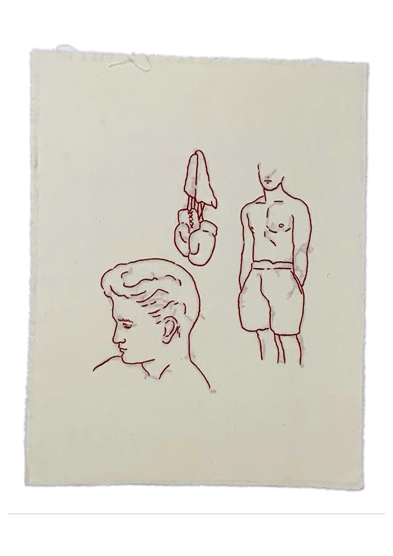 Die Materialität des Garns und die traditionelle Technik der Stickerei werden hier in den Dienst queerer Erzählungen gestellt: Das vermeintlich „häusliche“ Handwerk wird politisch und persönlich aufgeladen, indem es die Darstellung schwuler Begehren, Unsicherheiten und Erinnerungen auf eine poetische, fast sakrale Weise formt. Die Verbindung von Texten und Bildern junger Männer, entlehnt aus Werbeprospekten und ebenfalls gestickt, eröffnet ein Spannungsfeld zwischen Konsumästhetik, Körperbildern und subjektiver Erinnerung. Die Stickerei transformiert die reproduzierten, oft normierten Werbebilder in fragile, reflektierende Objekte, die die Zerbrechlichkeit und Vielschichtigkeit von Selbstwahrnehmung und Begehren sichtbar machen.