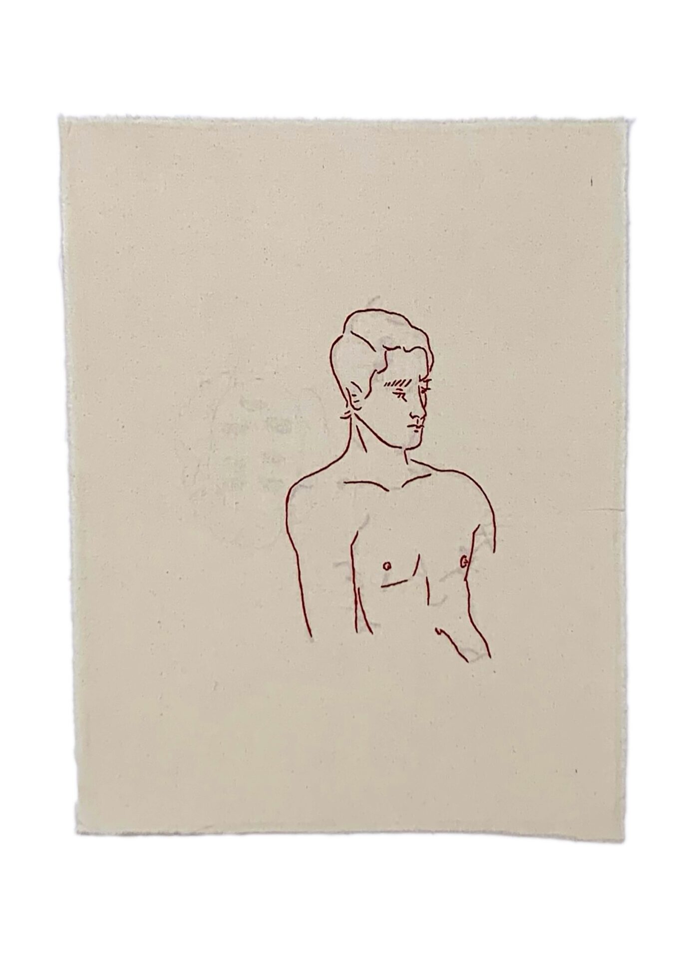 Die Materialität des Garns und die traditionelle Technik der Stickerei werden hier in den Dienst queerer Erzählungen gestellt: Das vermeintlich „häusliche“ Handwerk wird politisch und persönlich aufgeladen, indem es die Darstellung schwuler Begehren, Unsicherheiten und Erinnerungen auf eine poetische, fast sakrale Weise formt. Die Verbindung von Texten und Bildern junger Männer, entlehnt aus Werbeprospekten und ebenfalls gestickt, eröffnet ein Spannungsfeld zwischen Konsumästhetik, Körperbildern und subjektiver Erinnerung. Die Stickerei transformiert die reproduzierten, oft normierten Werbebilder in fragile, reflektierende Objekte, die die Zerbrechlichkeit und Vielschichtigkeit von Selbstwahrnehmung und Begehren sichtbar machen.