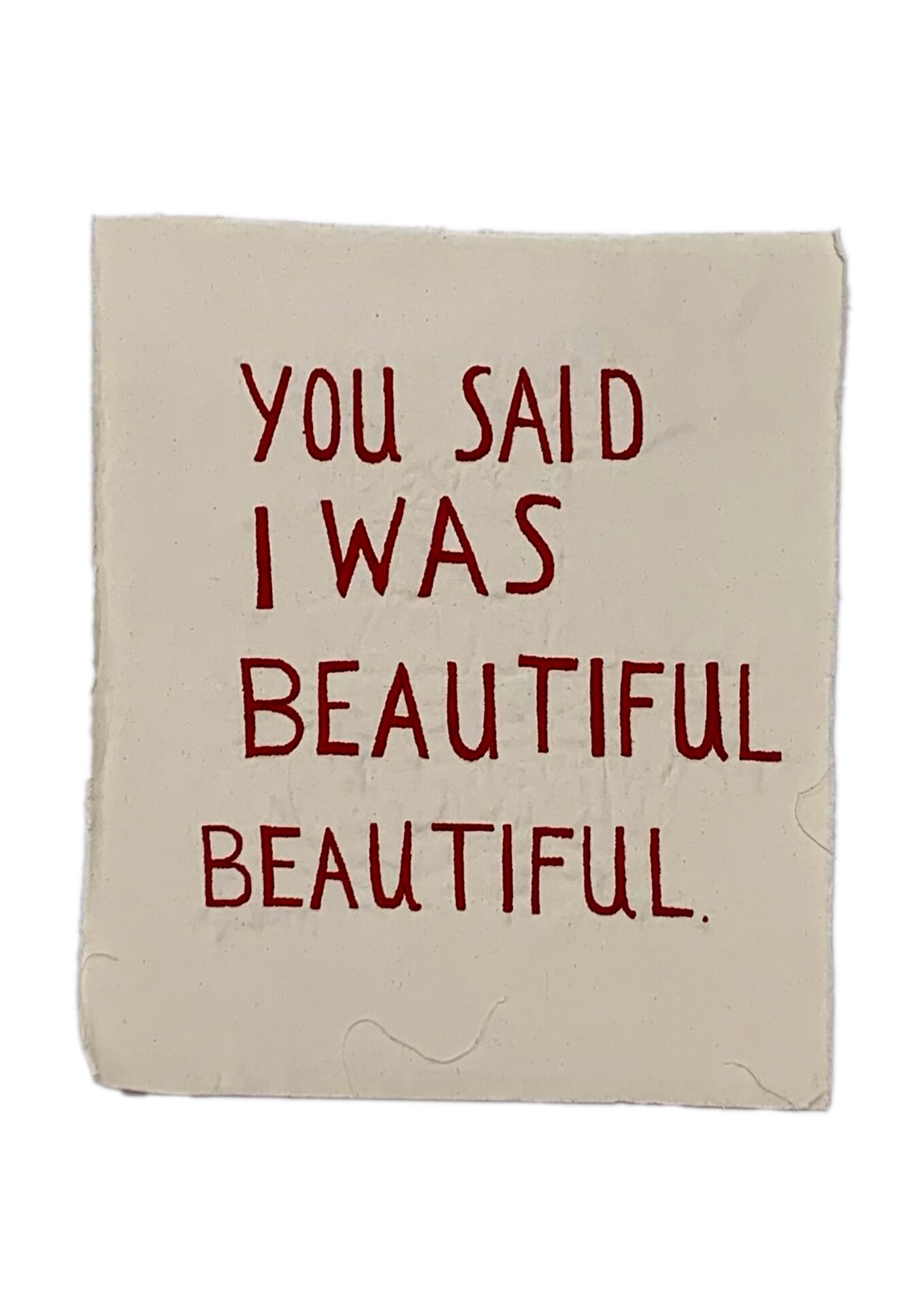 Die Werkgruppe „I remember …“ verwebt intime, fragmentarische Erinnerungen und Reflexionen mit einer bemerkenswerten Materialität. Die Texte, in rotem Garn auf Nessel handgestickt, sind private Einträge, in denen persönliche Sehnsüchte, Zweifel und Momente flüchtiger Schönheit niedergeschrieben werden. Sätze wie „Another lie I tell myself“ oder „you know we can’t all be beautiful“ lesen sich wie Auszüge aus einem Tagebuch, das gleichzeitig poetisch, verletzlich und schonungslos ehrlich ist. Die Handarbeit der Stickerei verleiht diesen Worten ein taktiles Gewicht – jede Naht, jede Linie ist ein Zeugnis der Zeit, der Mühe und der Intimität des Prozesses.