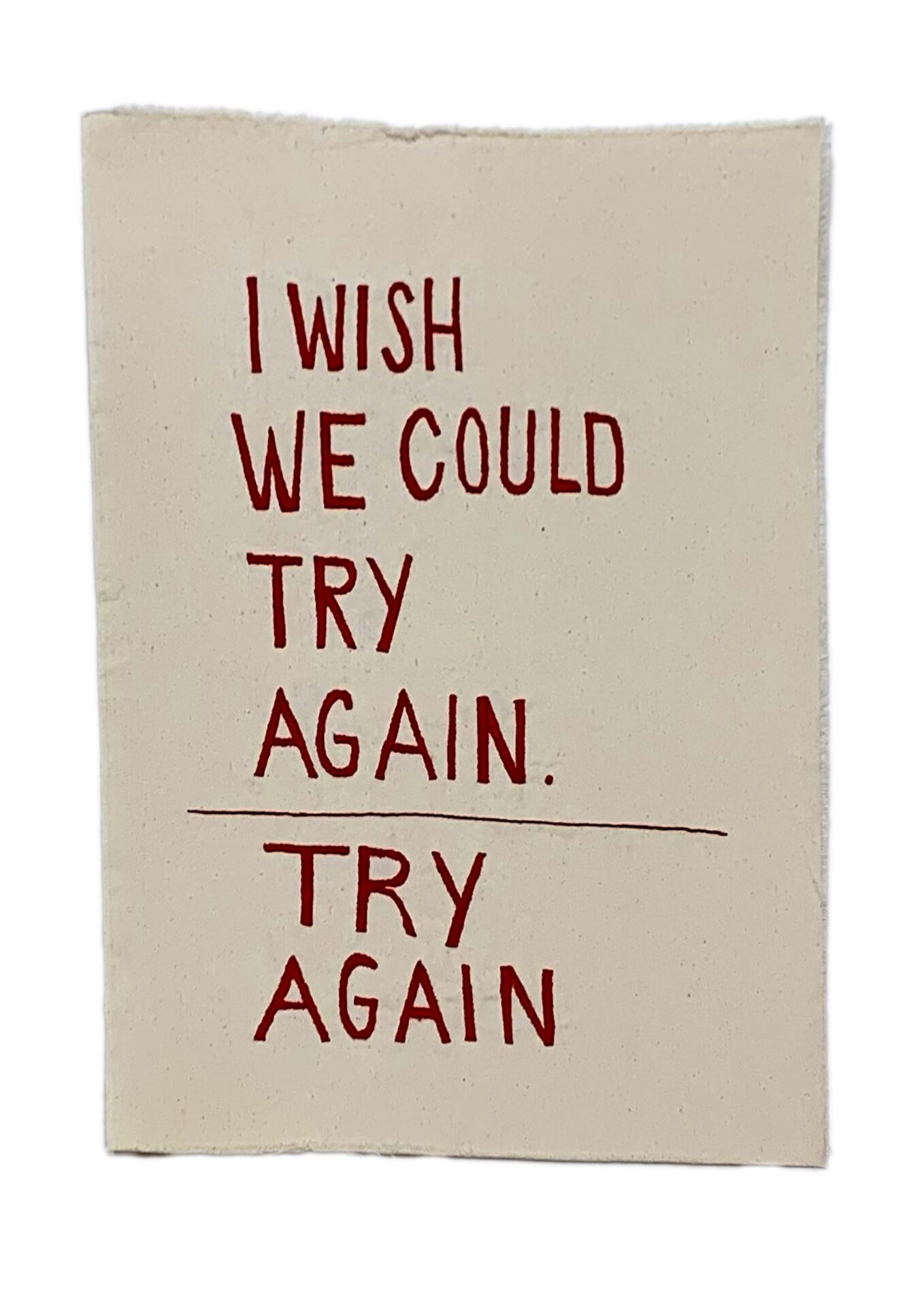Die Werkgruppe „I remember …“ verwebt intime, fragmentarische Erinnerungen und Reflexionen mit einer bemerkenswerten Materialität. Die Texte, in rotem Garn auf Nessel handgestickt, sind private Einträge, in denen persönliche Sehnsüchte, Zweifel und Momente flüchtiger Schönheit niedergeschrieben werden. Sätze wie „Another lie I tell myself“ oder „you know we can’t all be beautiful“ lesen sich wie Auszüge aus einem Tagebuch, das gleichzeitig poetisch, verletzlich und schonungslos ehrlich ist. Die Handarbeit der Stickerei verleiht diesen Worten ein taktiles Gewicht – jede Naht, jede Linie ist ein Zeugnis der Zeit, der Mühe und der Intimität des Prozesses.